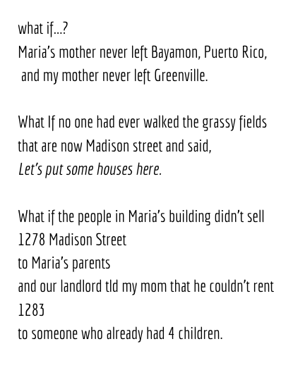 One of my favorite story lines is that of her and her friend Maria. They had such a strong and unique bond. I was thrilled to read an update about Maria in the Author’s Note. I love that they are “forever friends” and she helped Woodson remember the details for her life. One of my favorite pages is called, What If…? The poem starts like this…